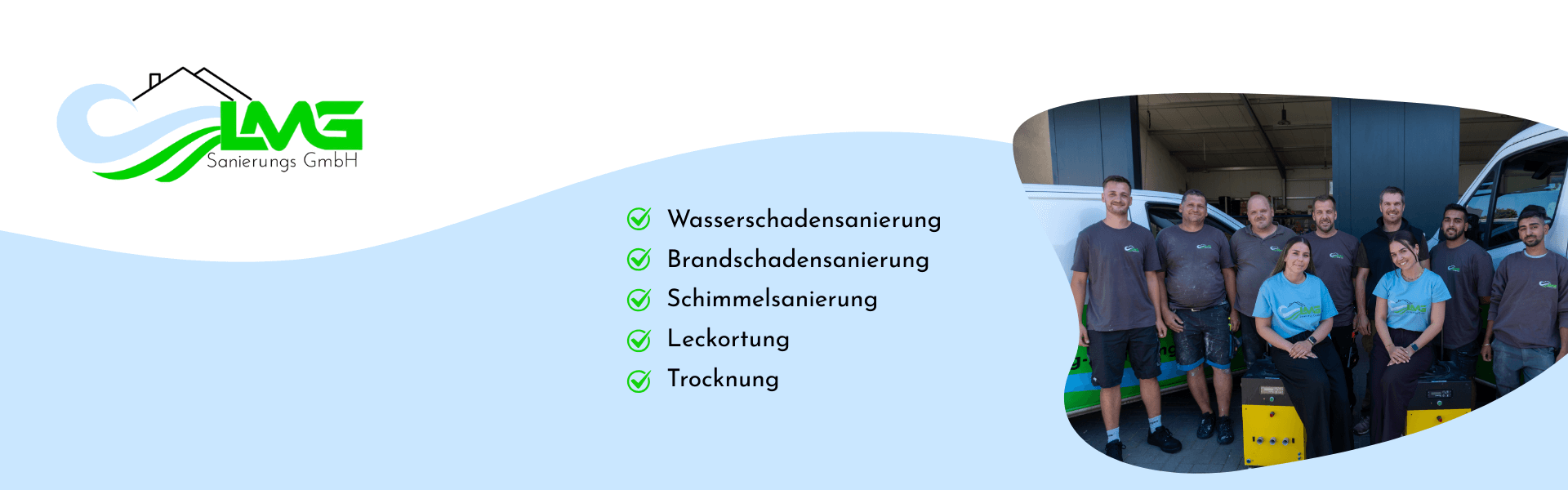 Die LMG Sanierungs GmbH ist Ihr verlässlicher Partner für professionelle Sanierungen. Ob Wasserschäden, Brandschäden, Schimmel oder Leckortung – unser zertifiziertes Fachpersonal und unsere modernen Geräte sorgen für schnelle und nachhaltige Lösungen. Mit jahrelanger Erfahrung und neuesten Arbeitsmethoden unterstützen wir Sie dabei, Ihr Zuhause oder Ihre Gewerbeimmobilie in den ursprünglichen Zustand zu versetzen.